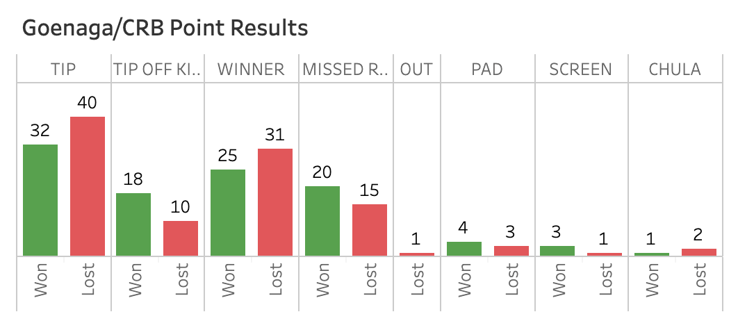 The transition to higher divisions was evident. Playing in Division 5 in Winter 2025, Goenaga/Flores won 49 points off a tip, another 32 off a tip from a kill shot, and 25 points from a missed rebote. In Division 4 in Fall 2025, Goenaga/CRB saw just 32 points won on a tip, 18 off a tip from a kill shot, and 20 from a missed rebote.